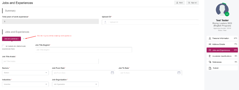 6. Kindly Fill in all manadatory field marked with * . As shown in the screenshot below, you can add multiple work experiences by clicking on the + sign. This would be the case for Academic qualification history as well.