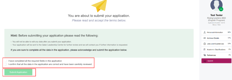 7. Once all the mandatory fields in each section are filled, click on Submit button. Check the boxes in this page to acknowledge that the information filled is accurate and was carefully reviewed.